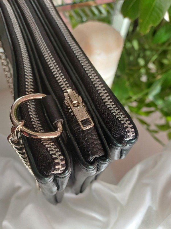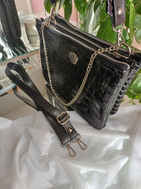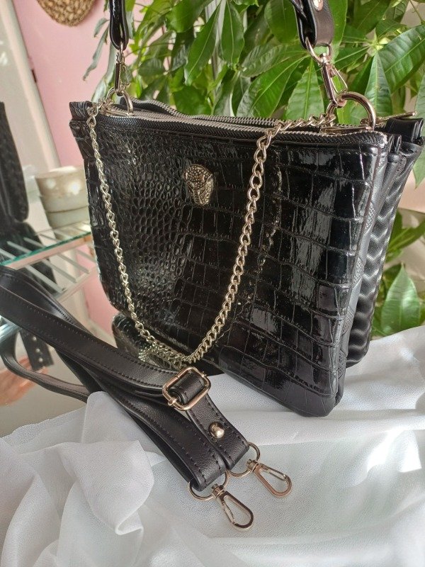 3 correas: morralera larga regulable, correa corta con tachas. Todas las opciones son desmontables (cadena fija)