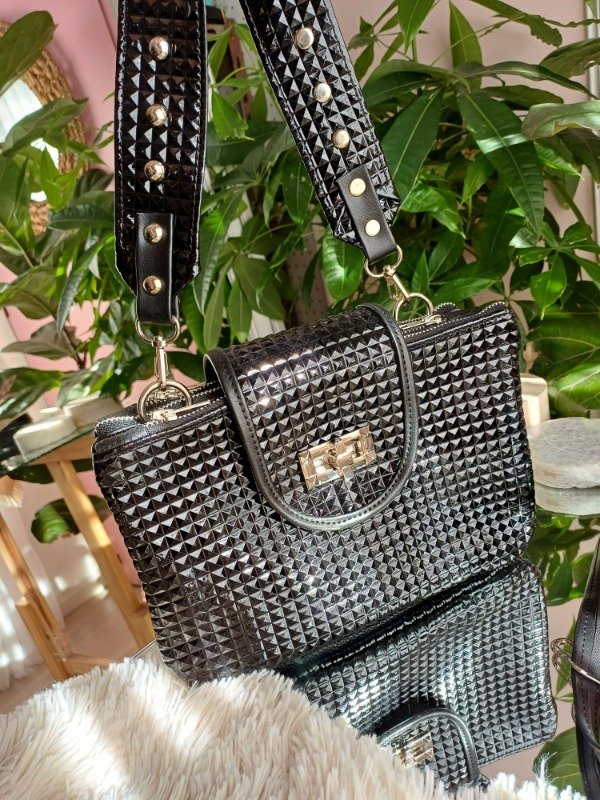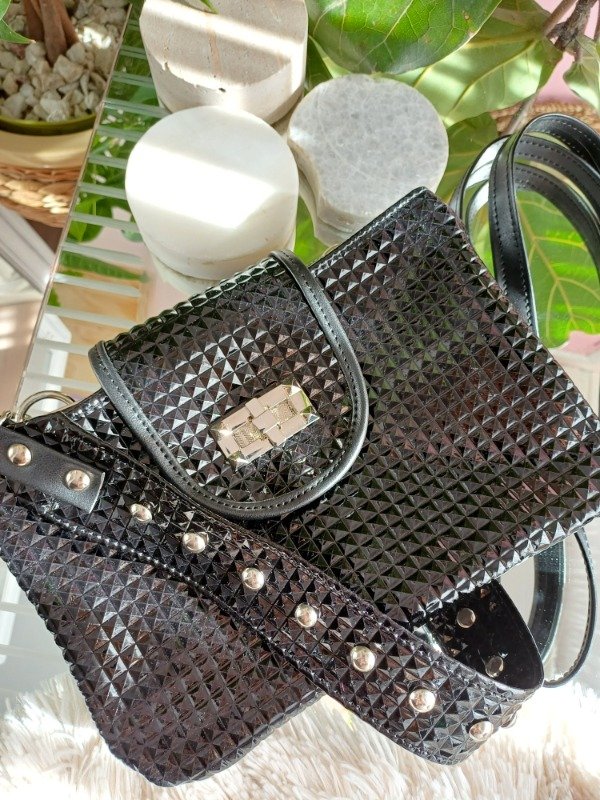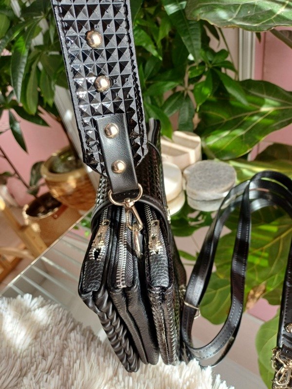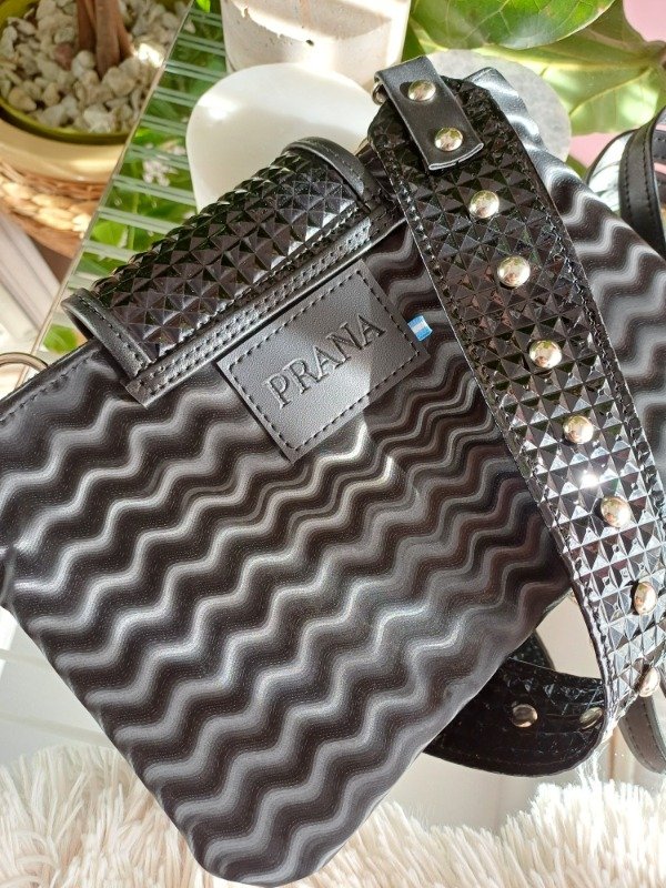correas: morralera larga regulable, correa corta con tachas. Todas las opciones son desmontables.