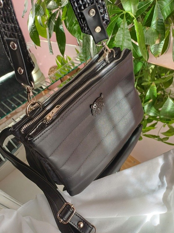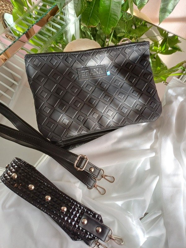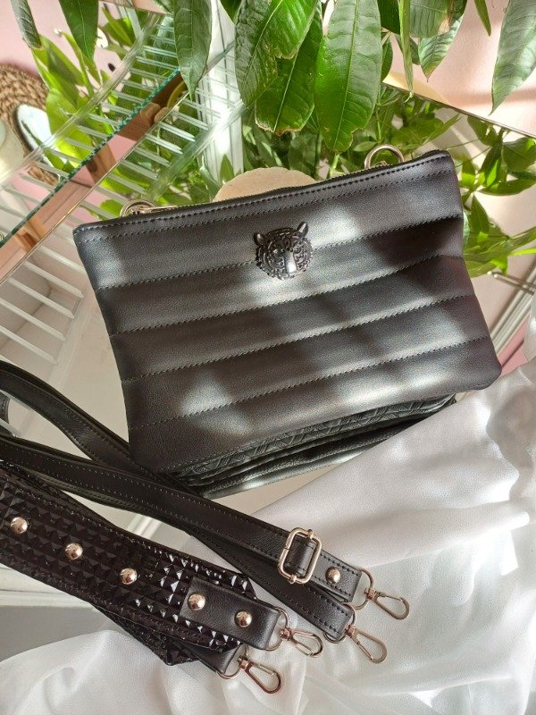 3 correas: morralera larga regulable, correa corta con tachas. Todas las opciones son desmontables (cadena fija)