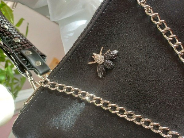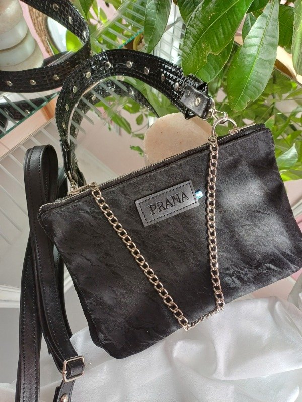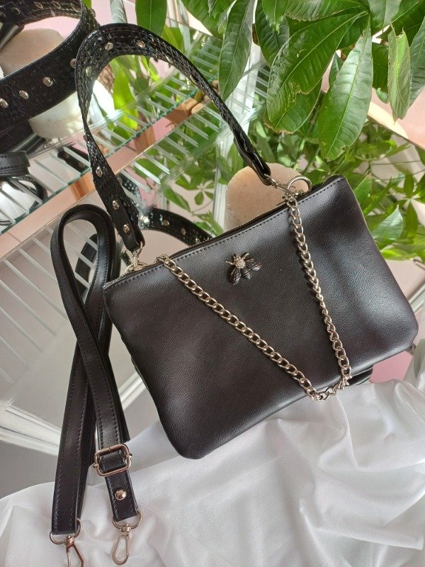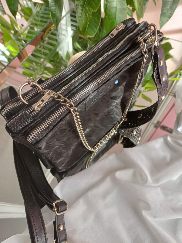 3 correas: morralera larga regulable, correa corta con tachas. Todas las opciones son desmontables (cadena fija)