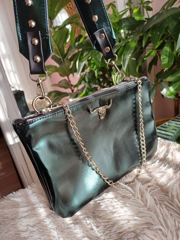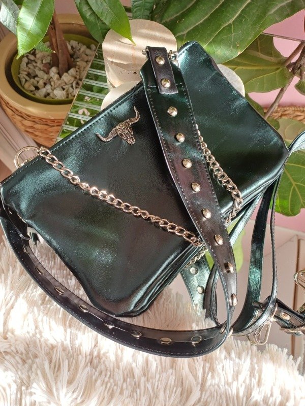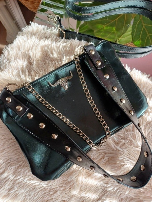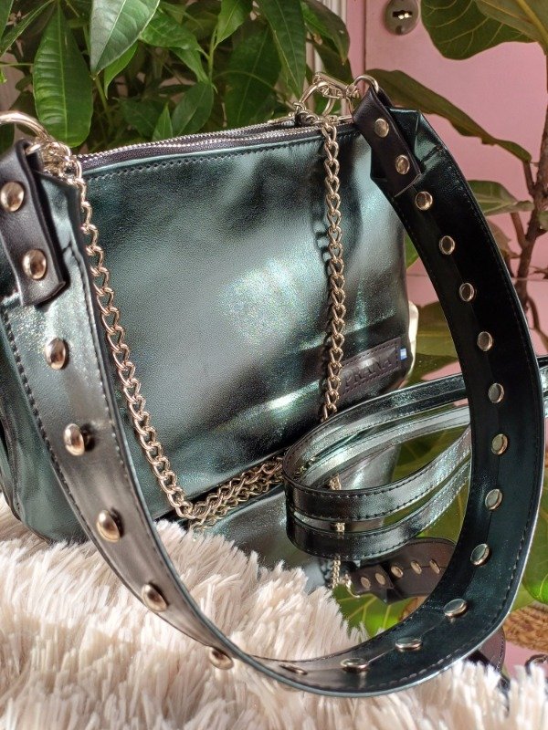 3 correas: morralera larga regulable, correa corta con tachas. Todas las opciones son desmontables (cadena fija)