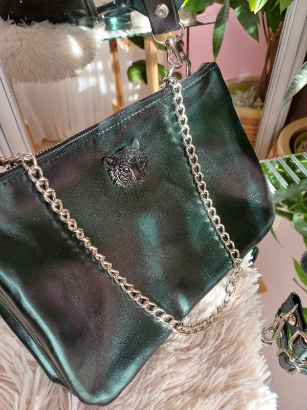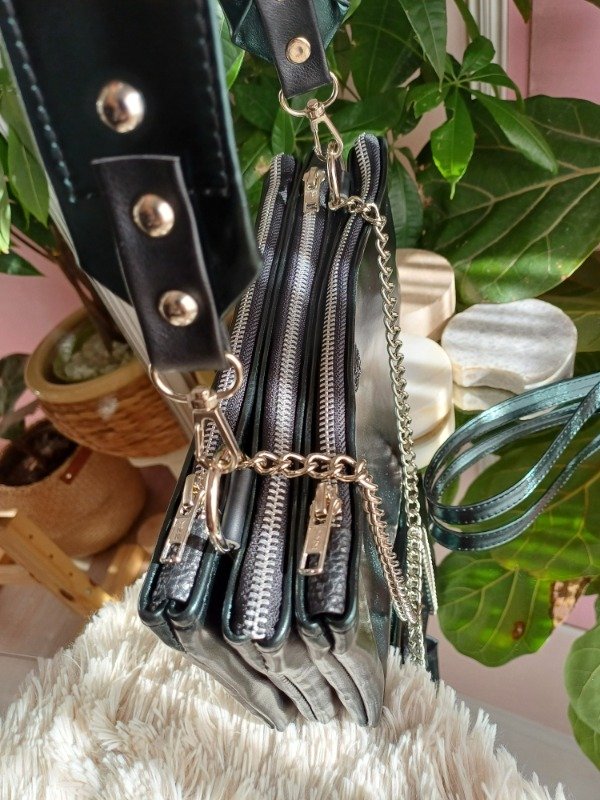 3 correas: morralera larga regulable, correa corta con tachas. Todas las opciones son desmontables (cadena fija)